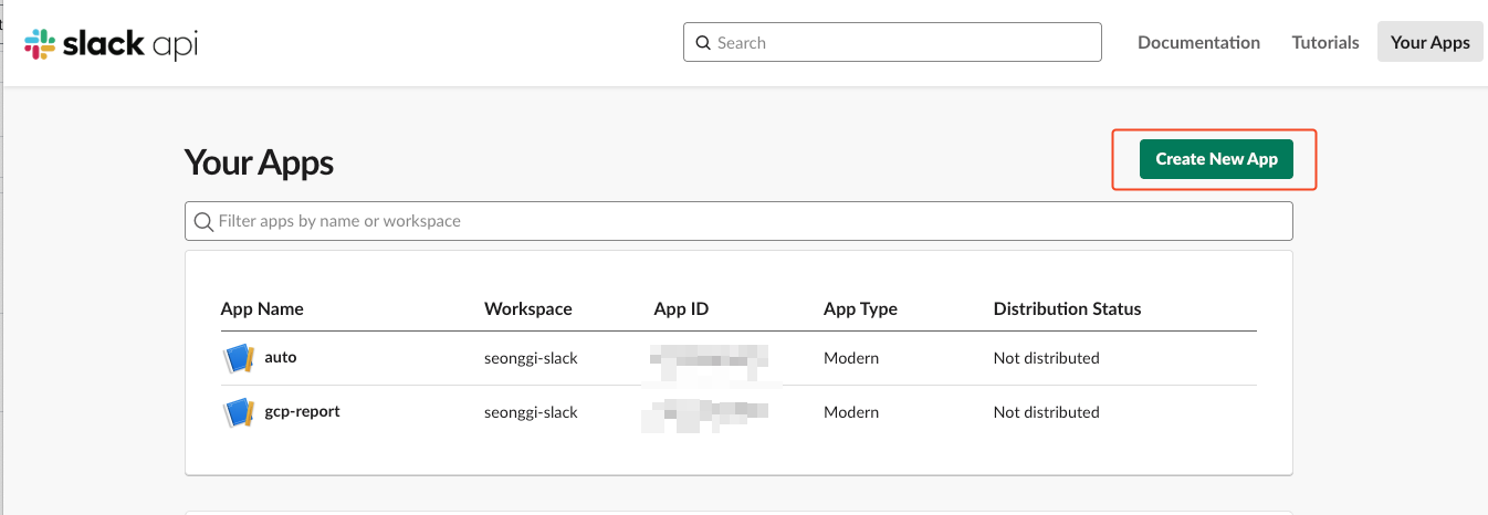 - https://api.slack.com/apps → Create New App 선택
