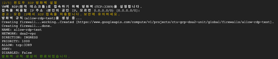 echo "VM에 RDP(원격 데스크톱)로 접속하기 위해 방화벽(TCP:3389)을 설정합니다."