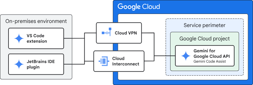 Private망 (Cloud VPN, Interconnect)를 통해 GCP의 Gemini Code Assist를 사용하는 방안입니다.