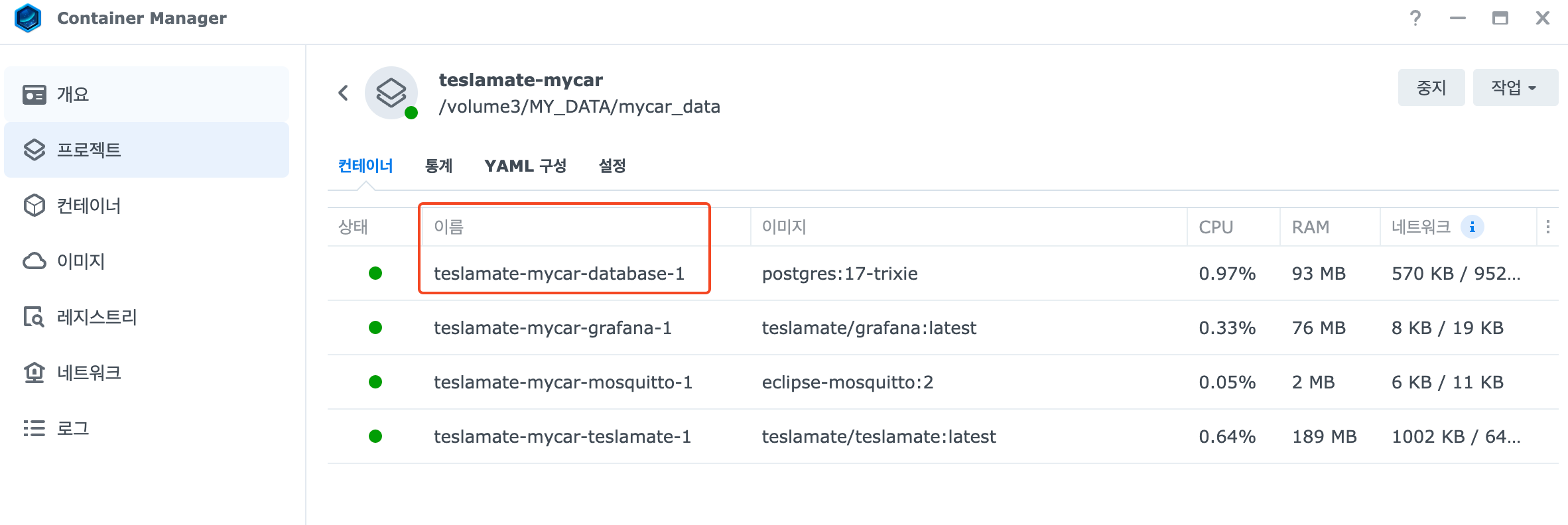 Container Manager → 프로젝트 → 이미지가 “postgres”(DBMS 입니다) 찾아 이름을 확인합니다.
