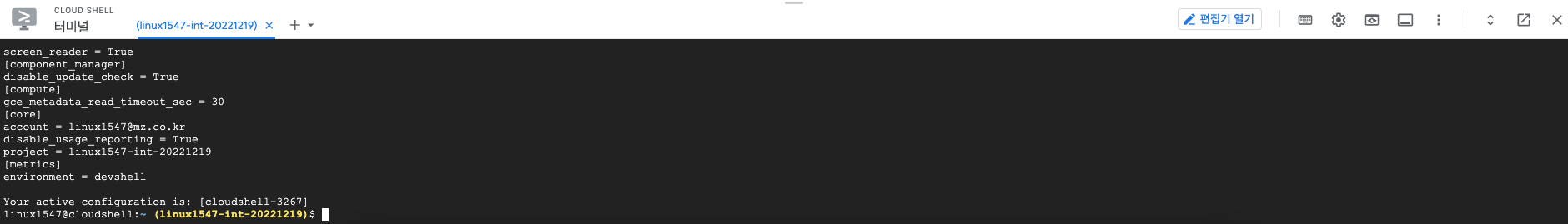 현재 설정된 프로젝트 $ export PROJECT_ID=$(gcloud config get-value project)Your active configuration is: [cloudshell-29945]