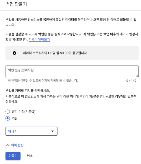 GCP Console → Cloud SQL → 백업 → 수동백업 or 자동백업