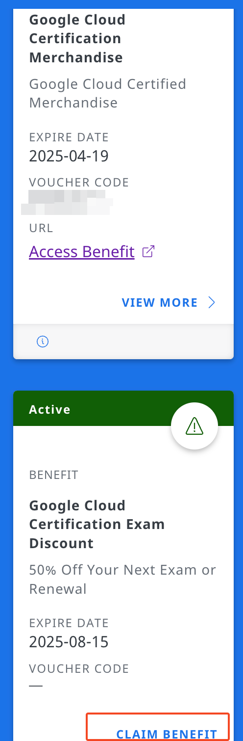 GCP자격증을 취득했다면, Merchandise와 다음 시험 50% 할인 바우처가 존재한다.