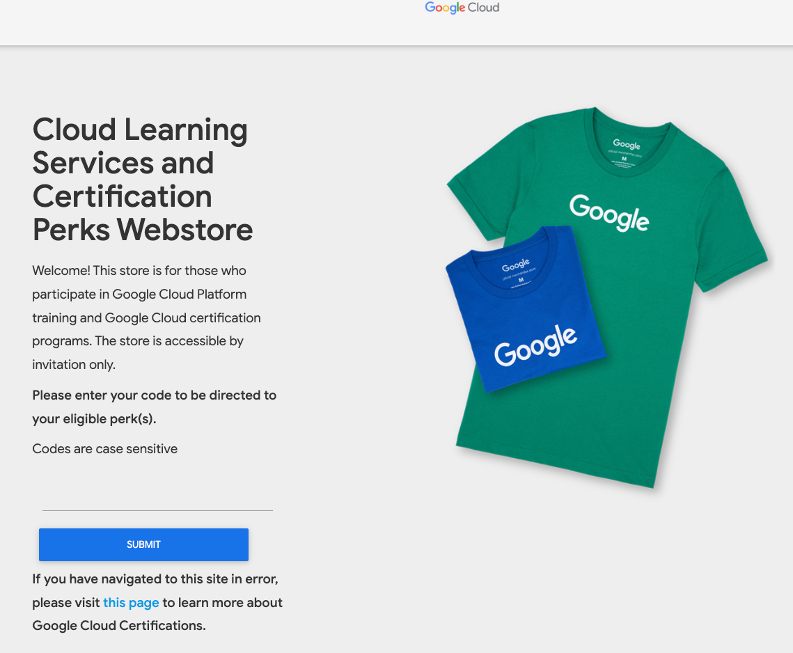 Cloud Learning Services and Certification Perks Webstore Welcome! This store is for those who participate in Google Cloud Platform training and Google Cloud certification programs. The store is accessible by invitation only. Please enter your code to be di