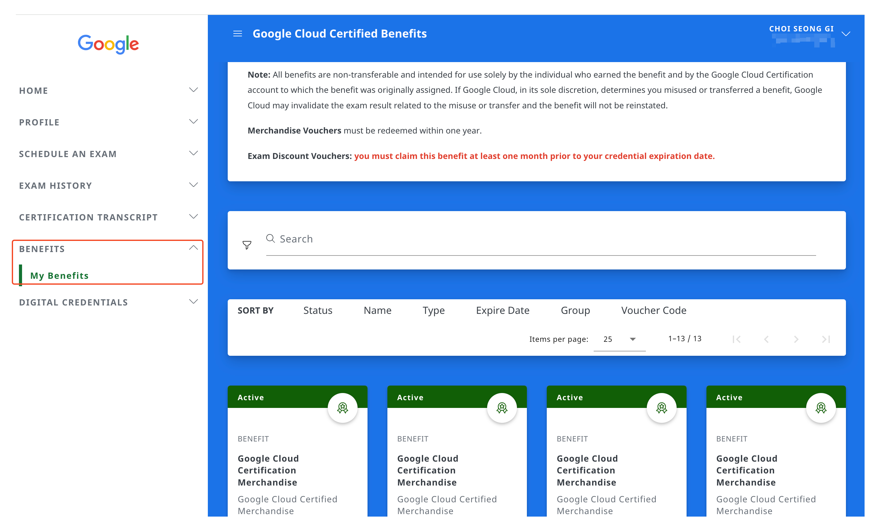 Google Cloud Certification에 접속 -> BENEFITS -> My Benefits로 이동