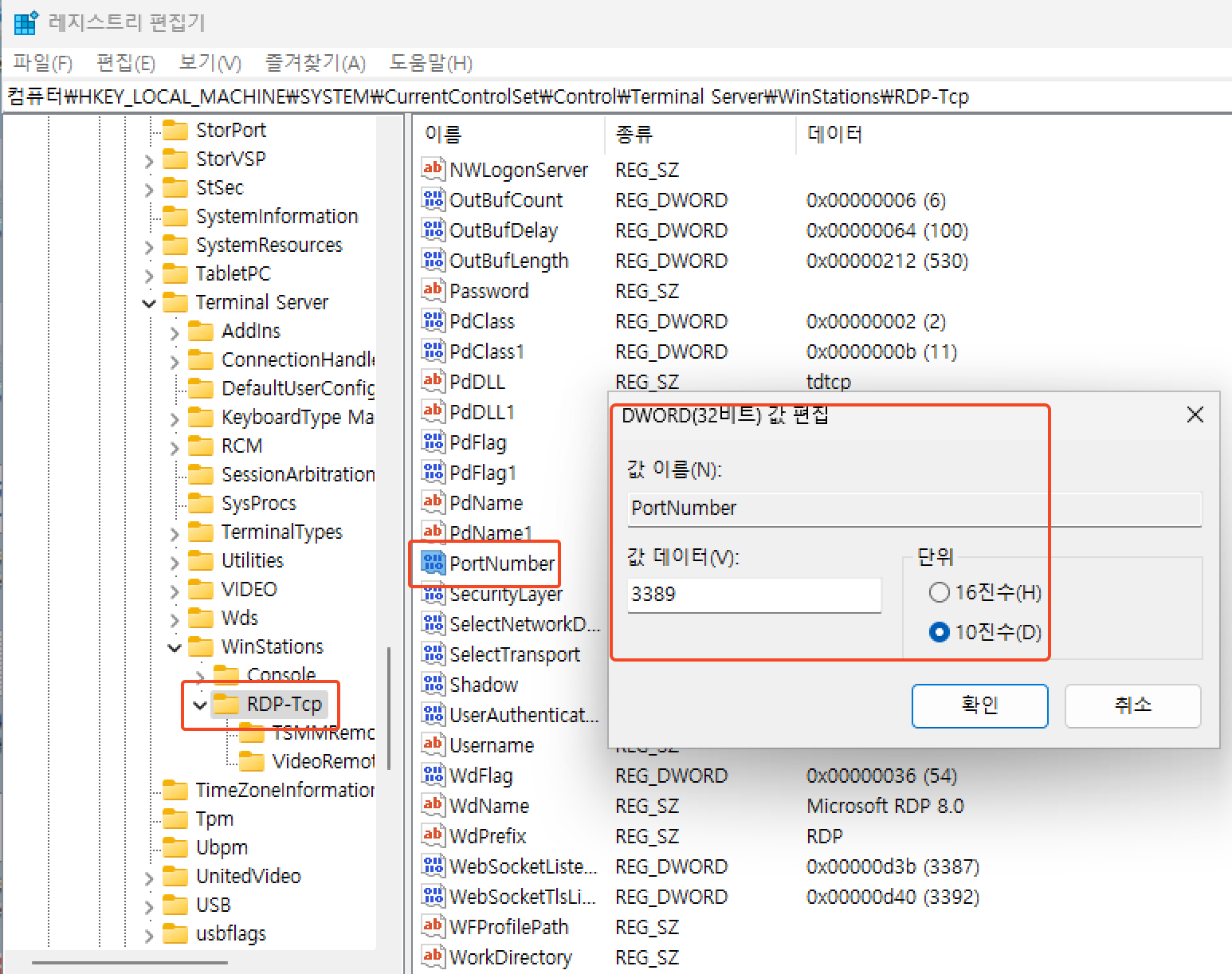 $portvalue = 3390 # 변경할 Portnumber를 변수 값을 저장합니다. 위에서는 3390으로 설정하였습니다. Set-ItemProperty -Path 'HKLM:\SYSTEM\CurrentControlSet\Control\Terminal Server\WinStations\RDP-Tcp' -name "PortNumber" -Value $portvalue New-NetFirewallRule -DisplayName 'RDPPORTLatest-TCP-In' -Profile 'Public' -Direction Inbound -Action Allow -Protocol TCP -LocalPort $portvalue New-NetFirewallRule -DisplayName 'RDPPORTLatest-UDP-In' -Profile 'Public' -Direction Inbound -Action Allow -Protocol UDP -LocalPort $portvalue