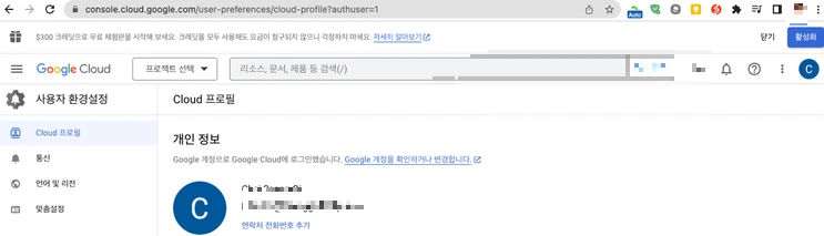 - GCP Console 접근 후에 “활성화”선택하여 사용이 가능하며 일반 Gmail과 다르게 추가로 $100을 받을 수 있다는 안내를 확인 할 수 있습니다.