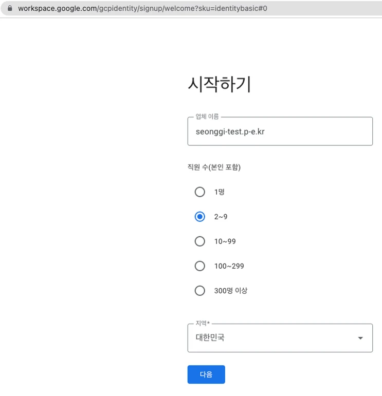 직원 수는 테스트 도메인이니 2~9명으로 선택하였습니다.