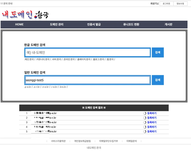 하여, 아래의 “내도메인.한국”에서 진행해보도록 하겠습니다.