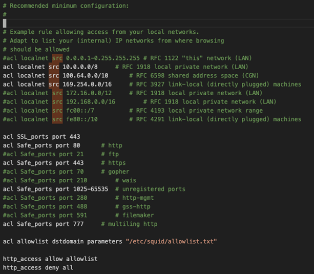 acl allowlist dstdomain parameters "/etc/squid/allowlist.txt" #허용할 도메인리스트 파일경로