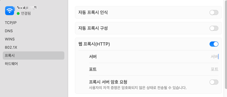 WebBrower -> 설정 -> 프록시 -> 프록시 설정 열기