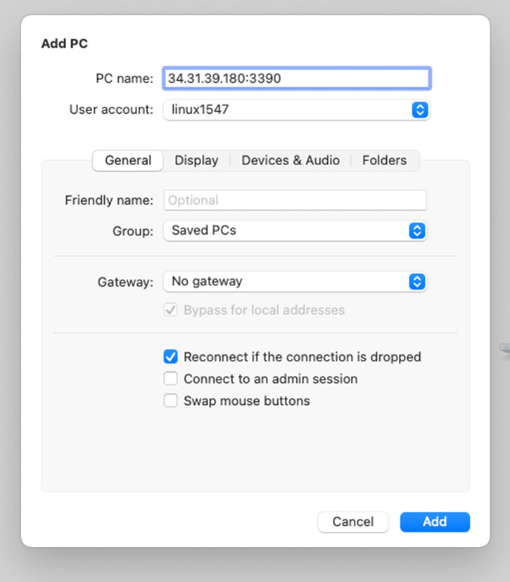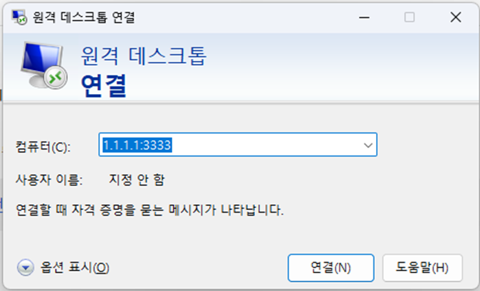 기본 포트인 3389라면 IP만 입력, 포트번호를 변경했다면 IP:포트번호