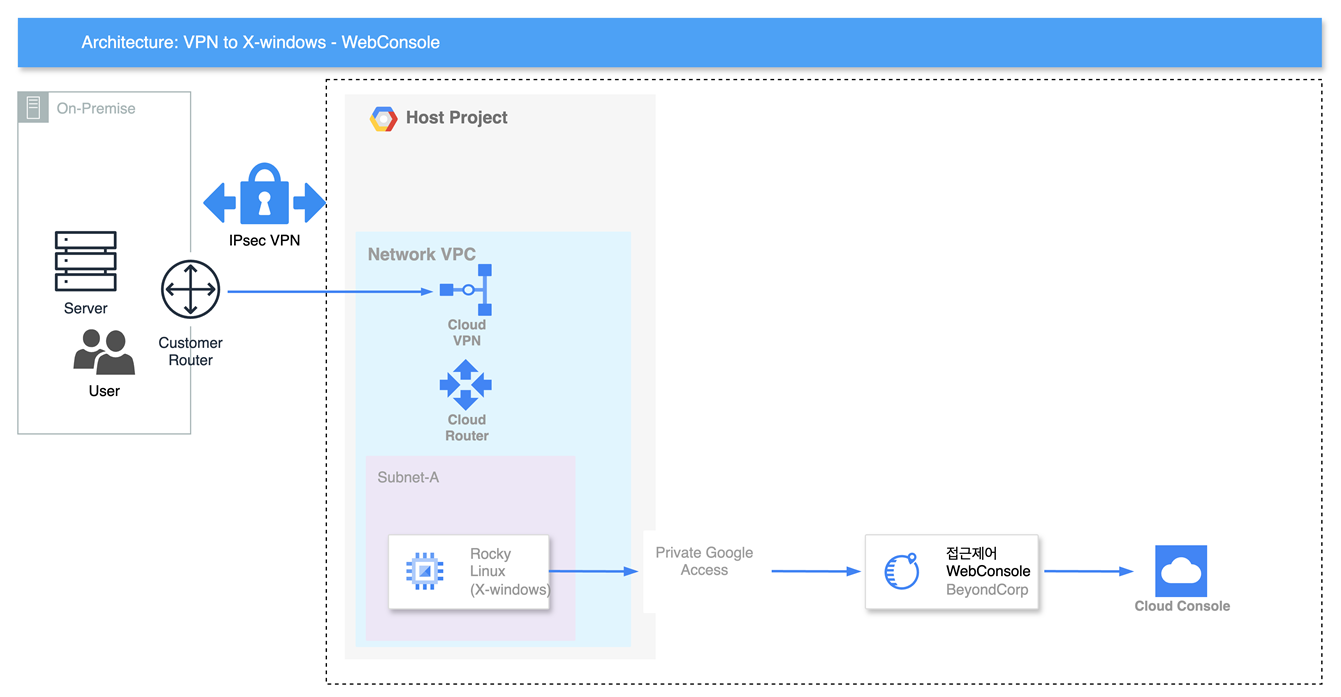 본 문서에서는 linux에 X-windows(GUI)를 사용하여, 사용자가 Private망으로 GCP의 VM 원격터미널에 접근 후 Webconsole을 사용하는 방안에 대해서 작성합니다.