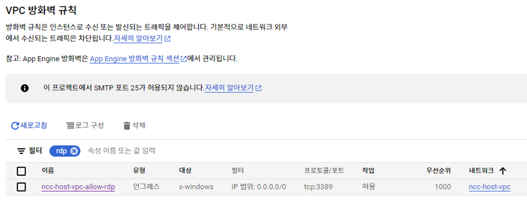 본 문서의 가정으로는 VPN, interconnect 를 통해 접속하므로 On-premis의 IP를 출발지로 도착지를 X-windows VM으로 설정합니다.