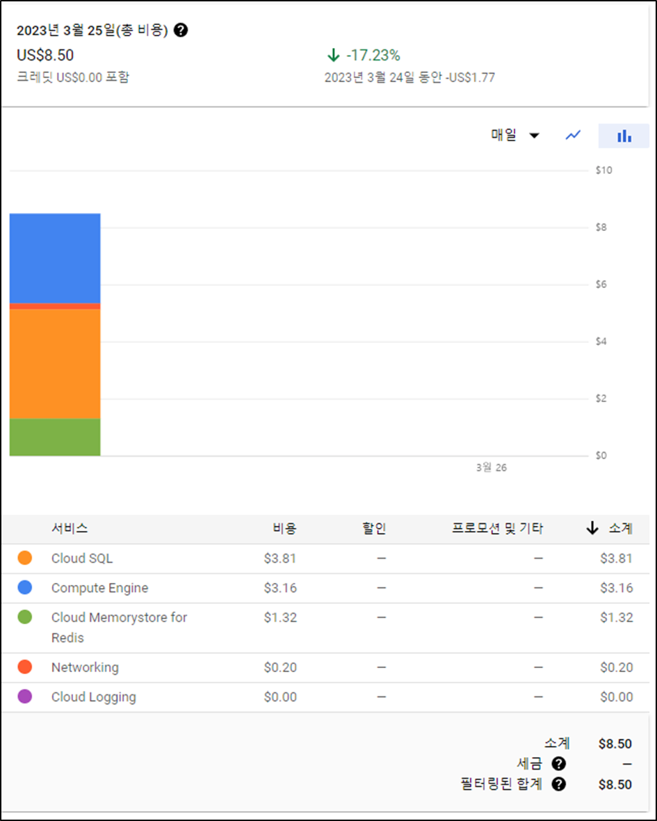 | Redis | Cloud Memorystore | 표준, 1GB | 복제 없음 |