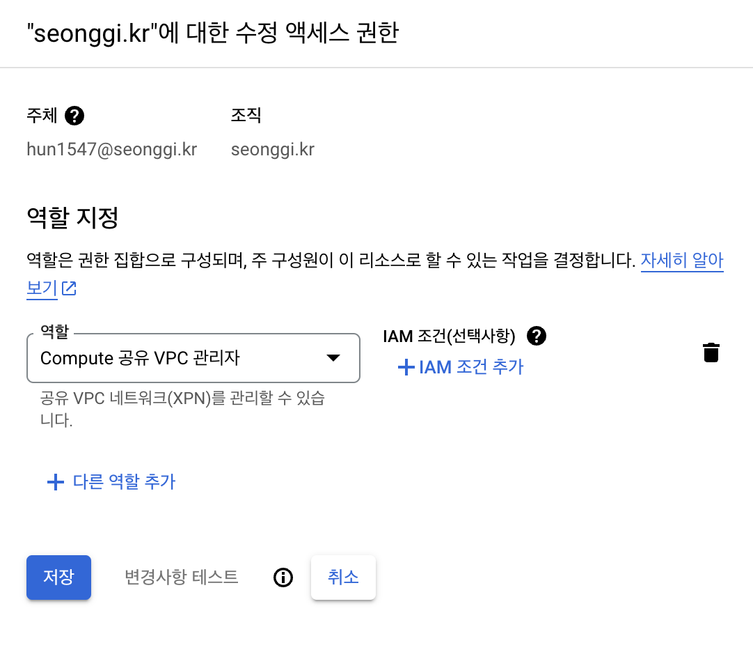 IAM에서 조직 권한에서 설정이 필요하며, “Compute 공유 VPC 관리자" 역활을 부여합니다.