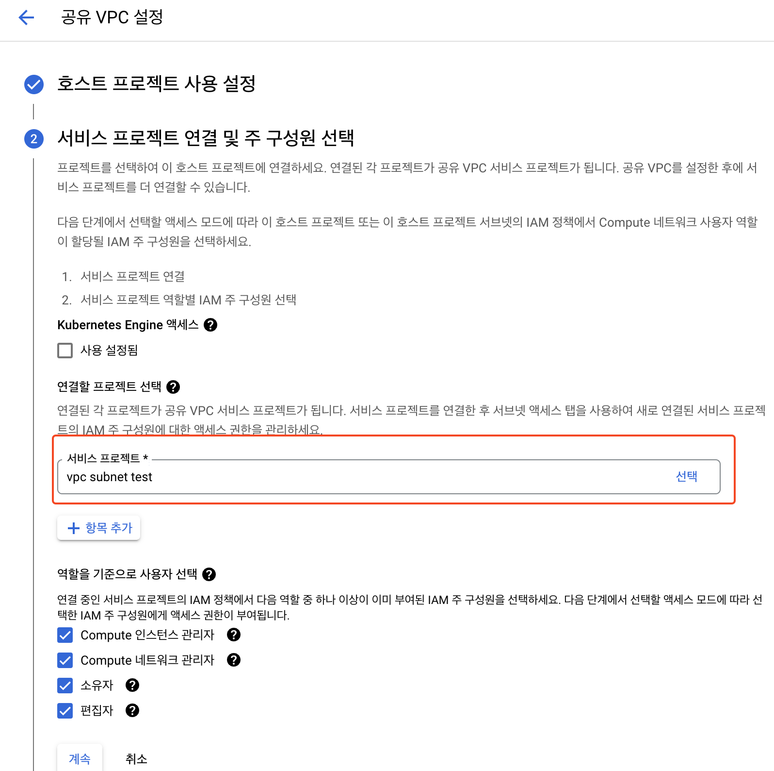 서비스 프로젝트와 연결이 된 후에는 서브넷에 대한 엑세스 권한을 부여합니다.