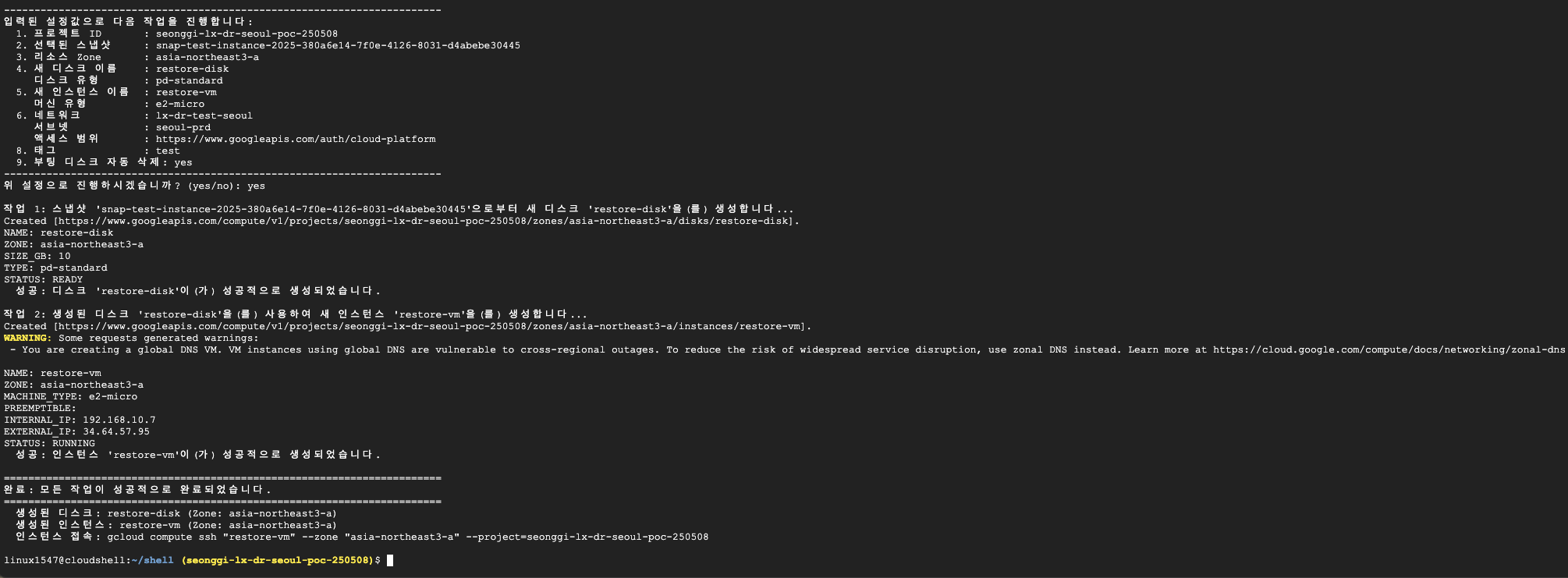 스크립트 실행 후, 생성된 VM에 바로 접속할 수 있는 gcloud compute ssh 명령어도 출력해줍니다.