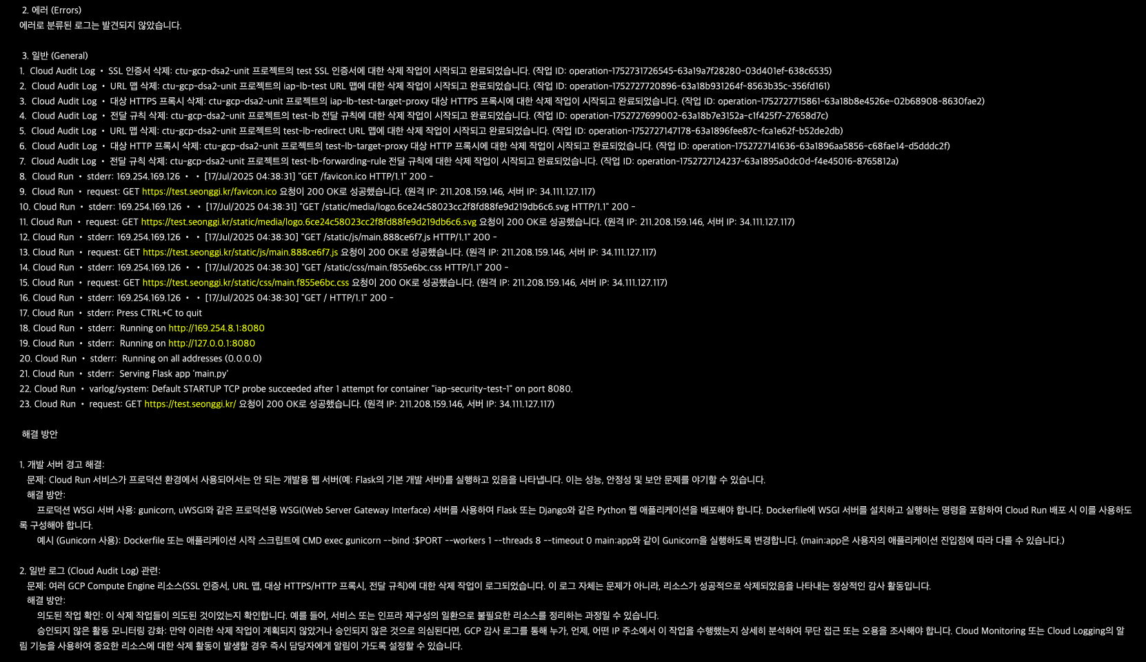 그래도 결국 캡쳐 화면에 보이듯 n8n의 AI Agent와 챗모델로는 Gemini 그리고 MCP 서버를 이용하여 매일 GCP의 프로젝트에서 에러, 경고 메시지와 일반로그(중복되는건 제거) 를 받아 메일과 슬랙으로 보고해주는 템플릿을 작성했습니다.