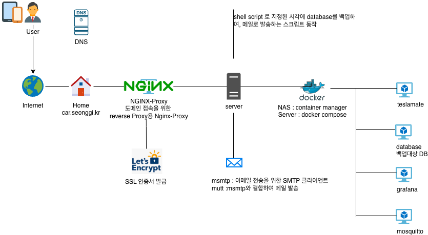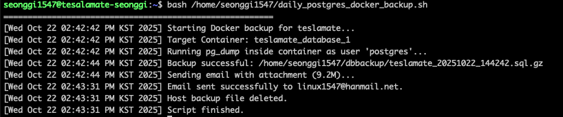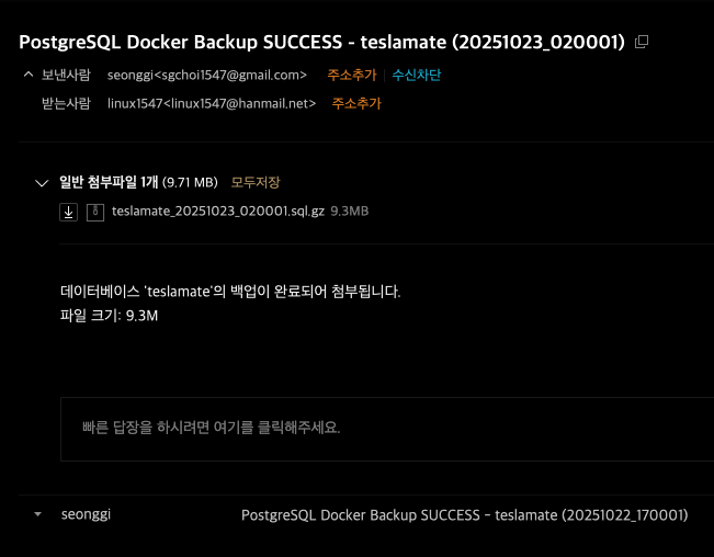 # 설명: Teslamate에서 사용되는 PostgreSQL 데이터베이스의 백업을 원하는 시간에 자동으로 백업받고, Gmail을 통해 원하는 메일로 전송합니다.