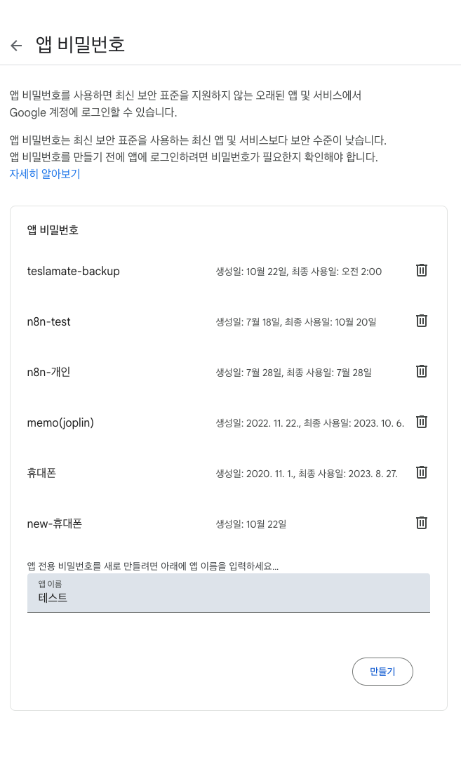 앱 비밀번호 리스트가 보입니다.