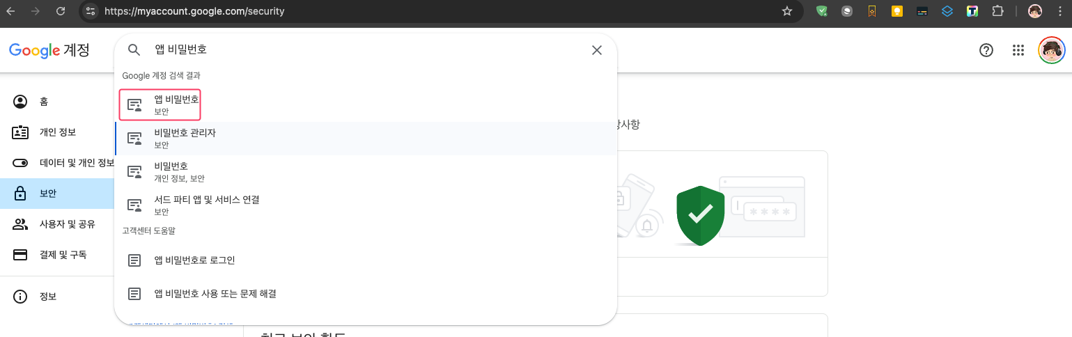 상단 검색창에 “앱 비밀번호" 입력