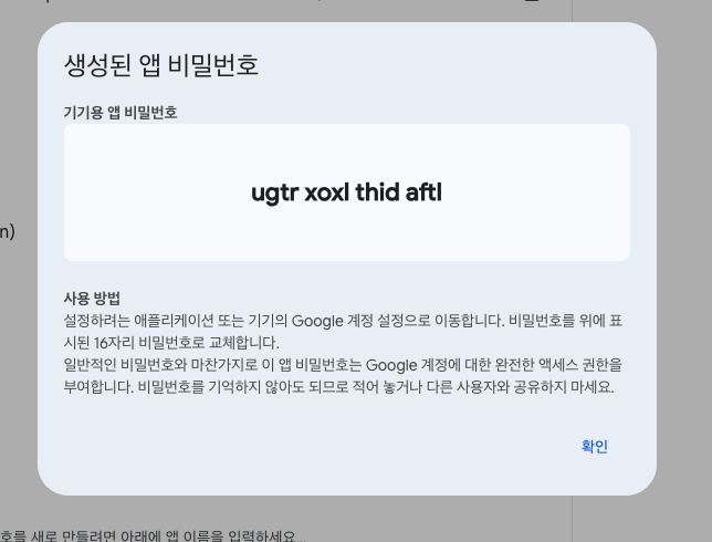 앱 비밀번호가 생성되었고, 해당 비밀번호는 첫화면에서만 볼 수 있으므로, 복사하여 비밀번호에 넣어줍니다.