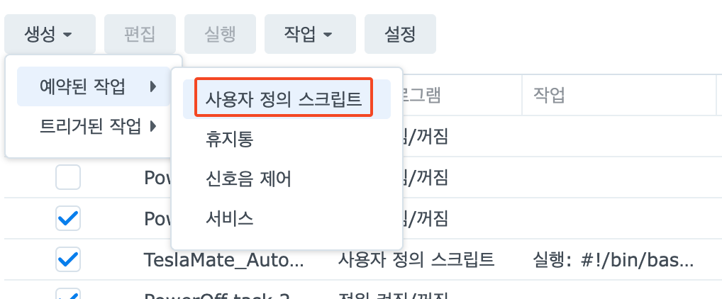 생성 → 예약된 작업 → 사용자 정의 스크립트 선택