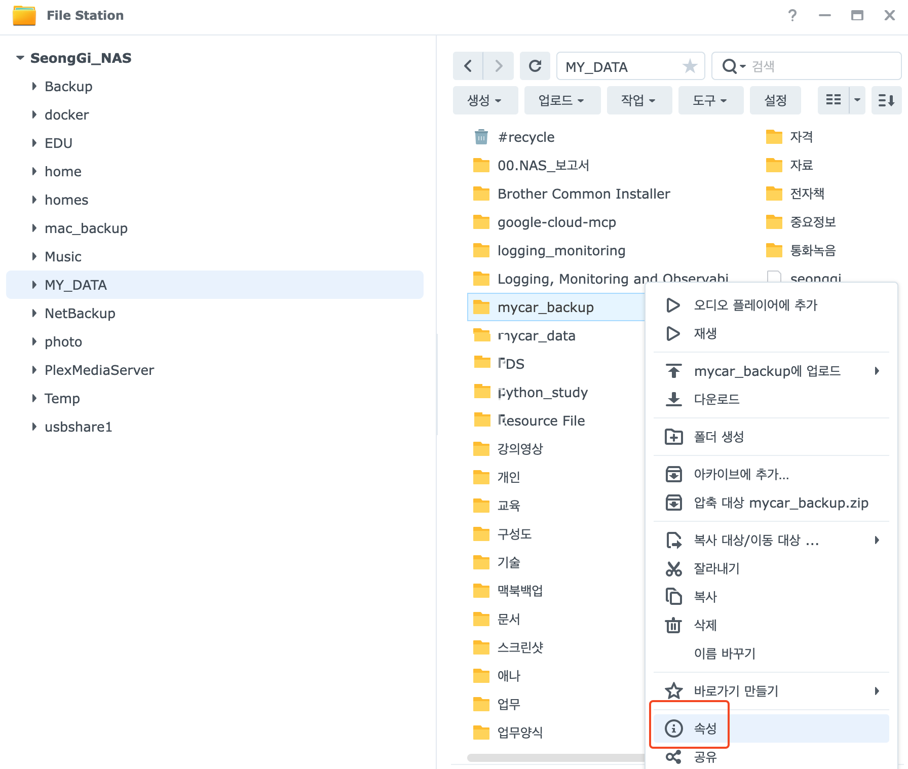 File Station → 저장하고자 하는 디렉토리에 가서 오른쪽 마우스 클릭 → 메뉴바에서 속성을 선택